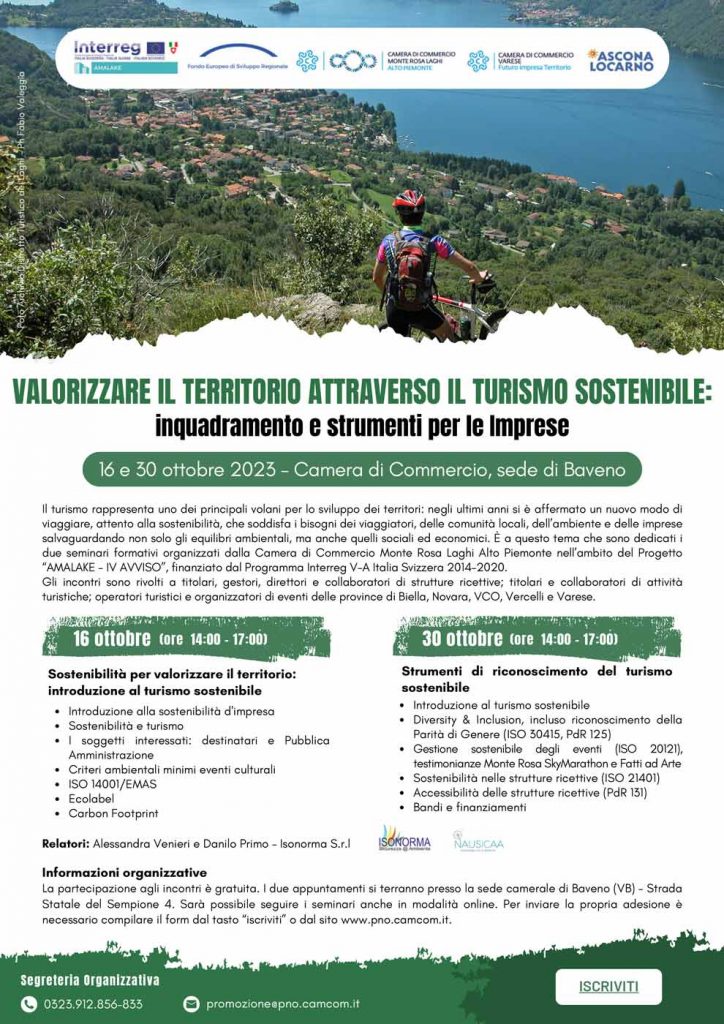 Il turismo rappresenta uno dei principali volani per lo sviluppo dei territori: negli ultimi anni si è affermato un nuovo modo di viaggiare, attento alla sostenibilità, che soddisfa i bisogni dei viaggiatori, delle comunità locali, dell’ambiente e delle imprese salvaguardando non solo gli equilibri ambientali, ma anche quelli sociali ed economici. È a questo tema che sono dedicati i due seminari formativi organizzati dalla Camera di Commercio Monte Rosa Laghi Alto Piemonte nell’ambito del Progetto “AMALAKE – IV AVVISO”, finanziato dal Programma Interreg V-A Italia Svizzera 2014-2020.